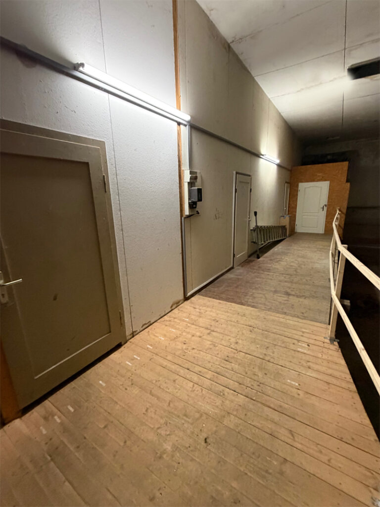Im Gebäude (direkt links ist der Lichtschalter für den Flur) befindet sich der Trainingsraum hinter der 2. Tür (erkennbar am Logo).